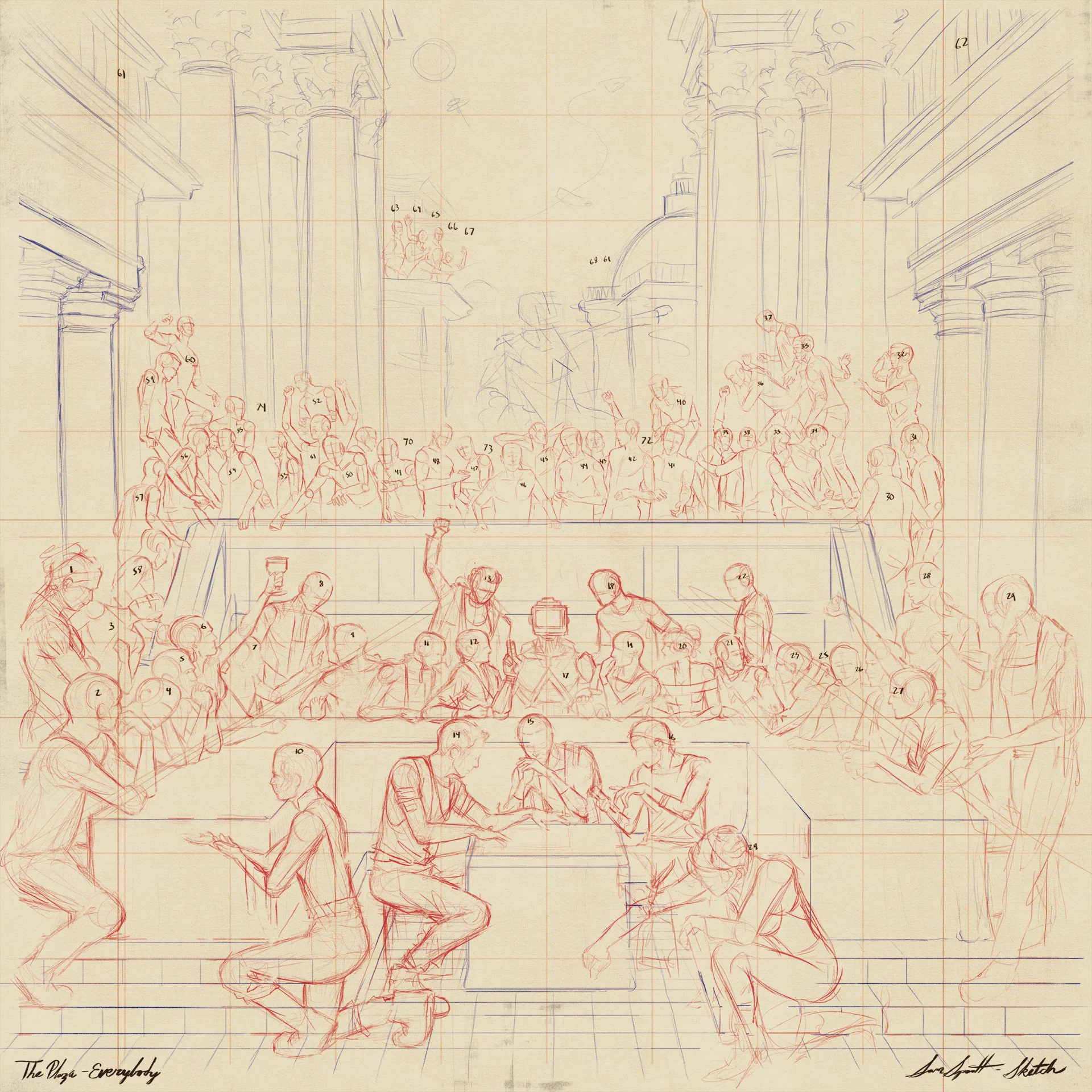This is the very first sketch that I sent to Logic for the Everybody cover art. It's different than my usual in that there's not even a hint at who anyone is or will be. This is because … we didn't know how many people there would be on the cover, who those people would be, or where they'd go, but we knew even with those questions unanswered, I had to begin somewhere. So I decided to treat the sketch less as a bottom layer of a painting, and more as a map: faceless poses and rough architecture all annotated with tiny numbers.